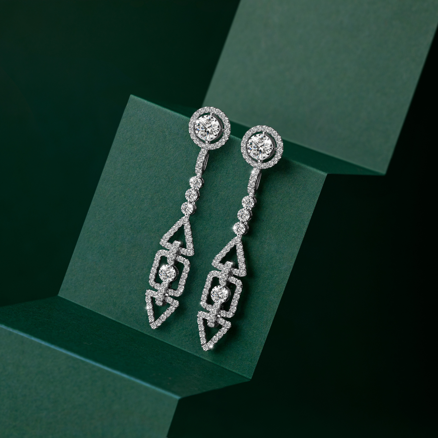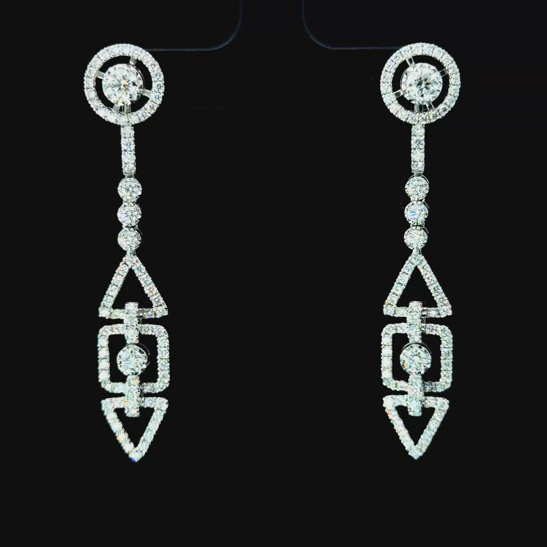 The Jubilee Diamond Lyrical Symmetry Collection Earrings - Round are a stunning blend of modern design and timeless elegance. These earrings feature a striking design incorporating circles, triangles and squares, creating a dynamic and attention-grabbing pattern. Strategically placed diamonds enhance the geometric shapes, making these earrings both daring and elegant. Perfect for adding a touch of sophistication to a formal look, these earrings are crafted with Jubilee Diamond's renowned craftsmanship and exquisite diamonds, ensuring a piece of jewelry you'll cherish for a lifetime.