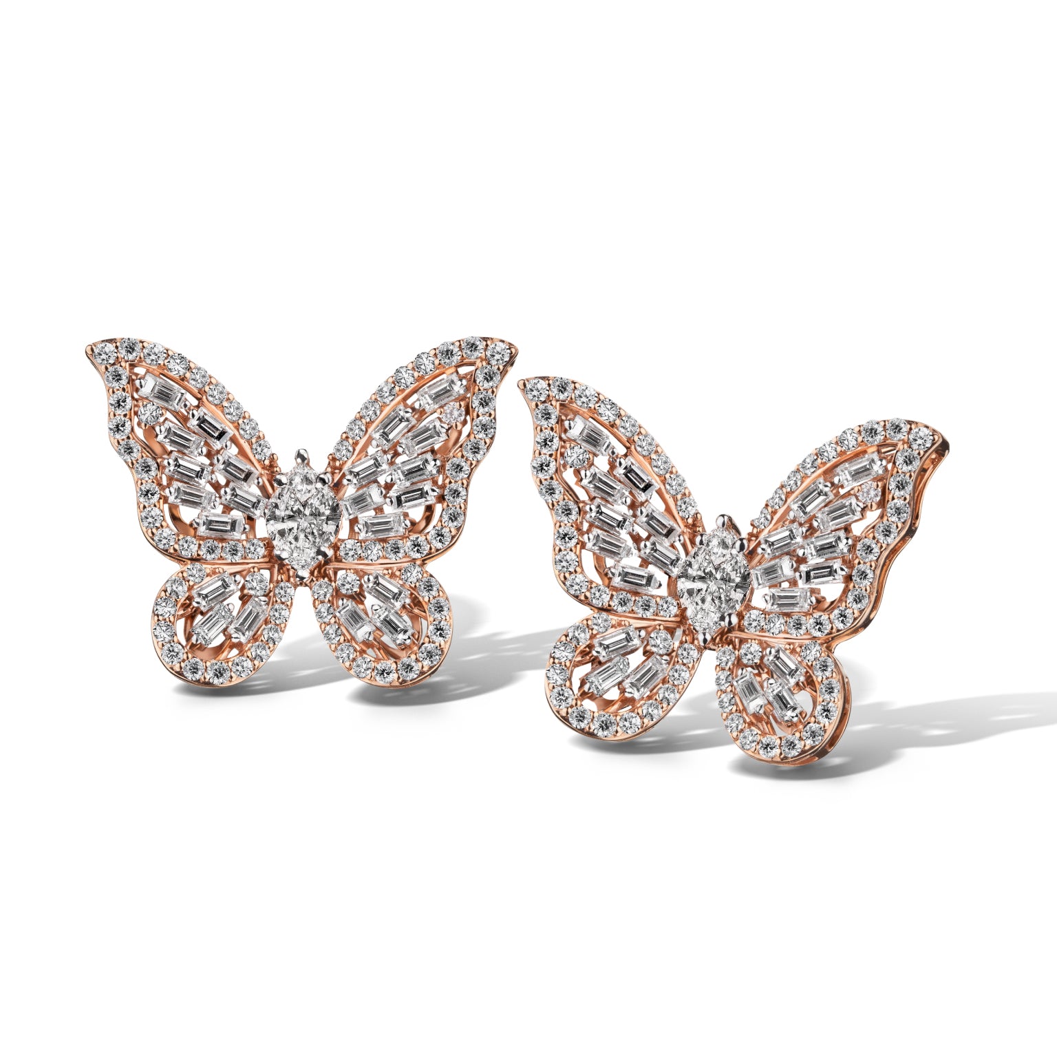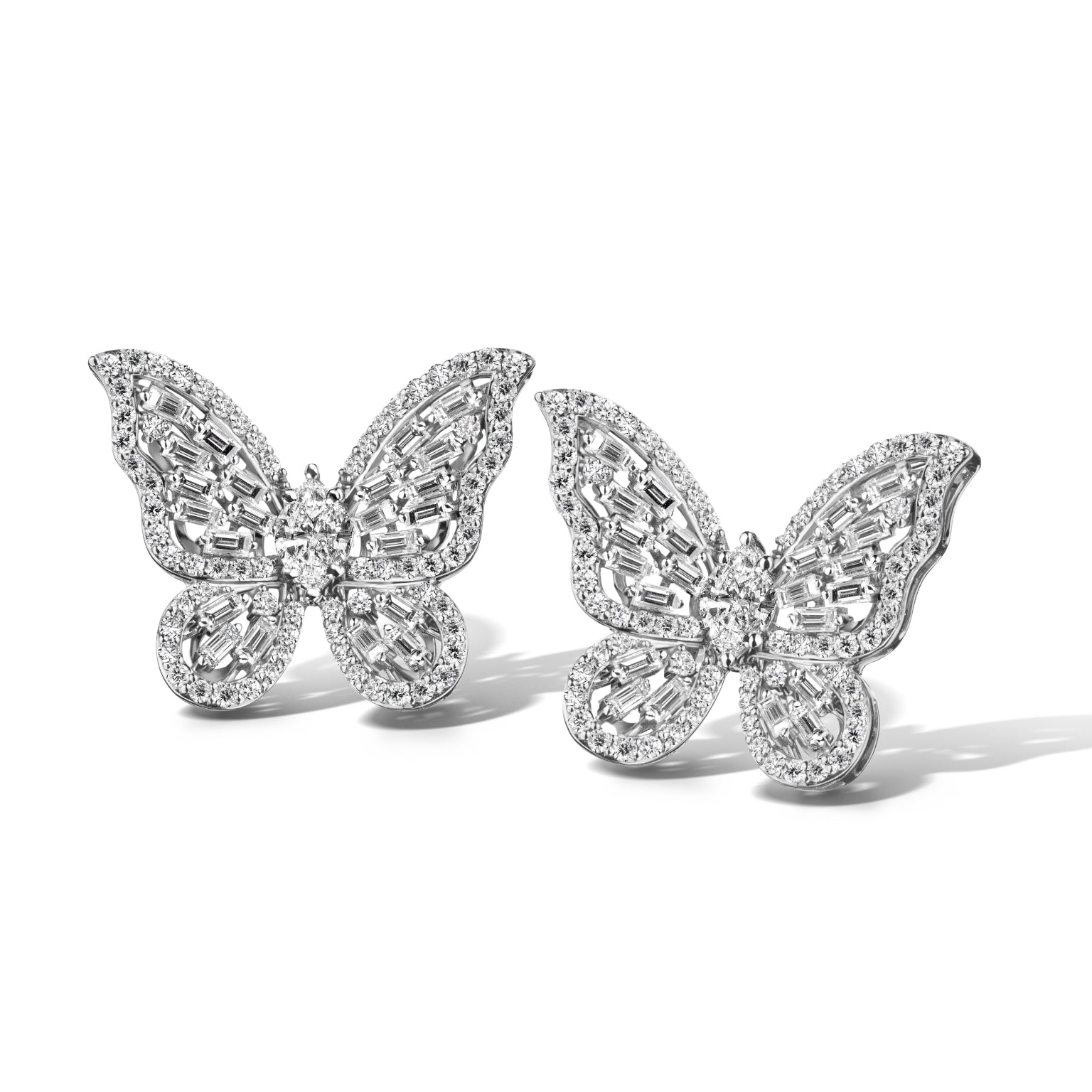 Butterfly Diamond Design: Butterfly design earrings adorned with Baguette-Cut and Round Brilliant-Cut Diamonds, creating an eye-catching elegance and style.