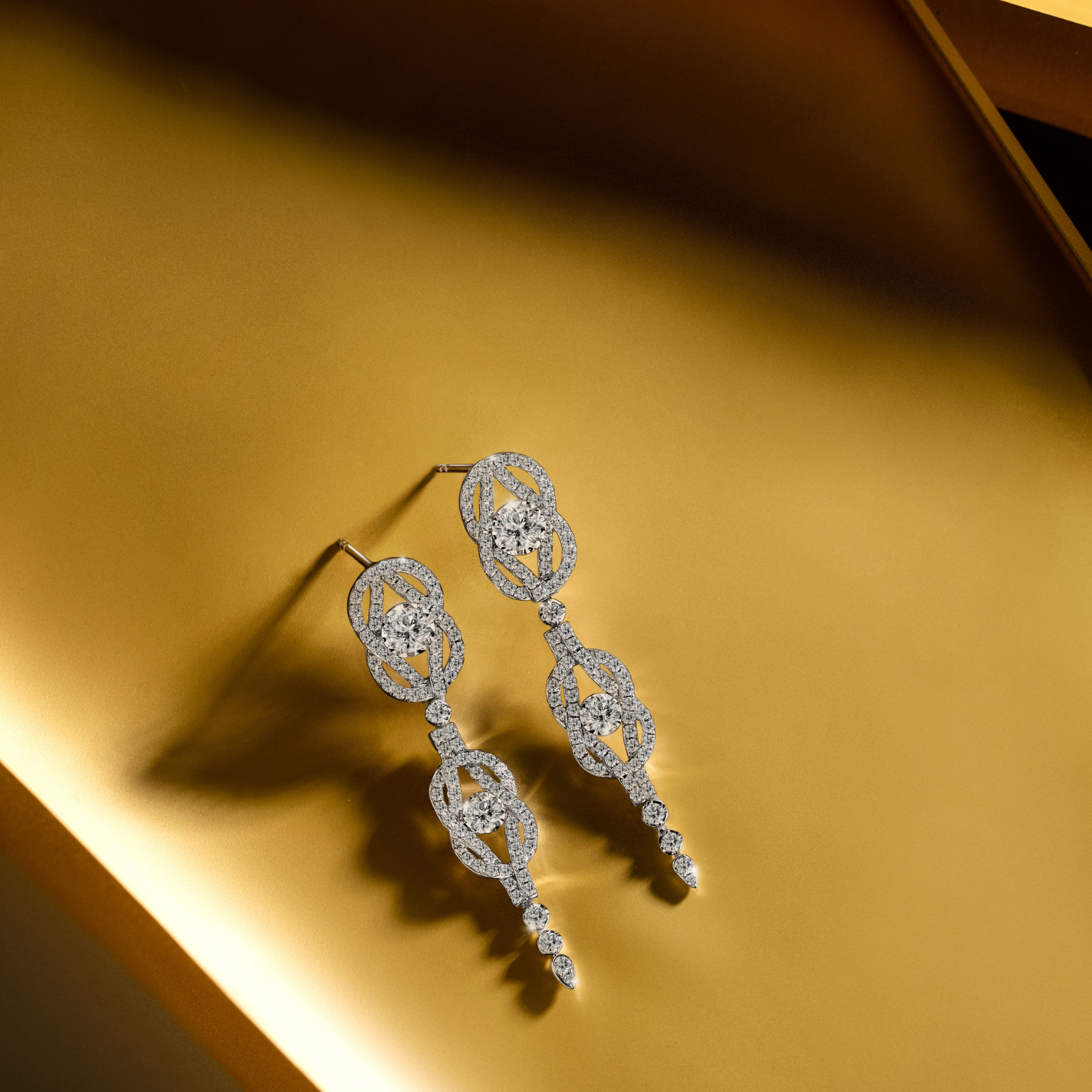 This pair of earrings is inspired by the intricate and beautiful art of ancient times, combined with a modern design. Round Brilliant-cut diamonds are set in an intricate pattern, creating an elegant and striking look in movement. The White Gold setting fully enhances the sparkle of the diamonds, creating a work of art that will impress the wearer on any special occasion.