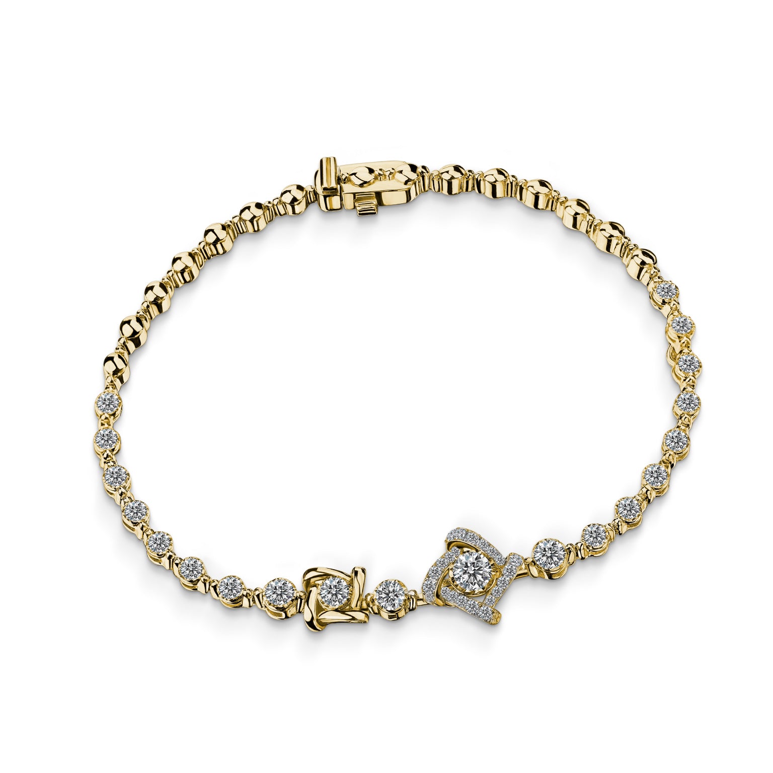 This bracelet is inspired by the combination of strength and delicacy, using a knot shape to symbolize connection and bonding. The diamond setting makes the bracelet sparkle beautifully from every angle, and the gold setting adds luxury and elegance to any occasion. This bracelet beautifully tells the story of love and bonding.