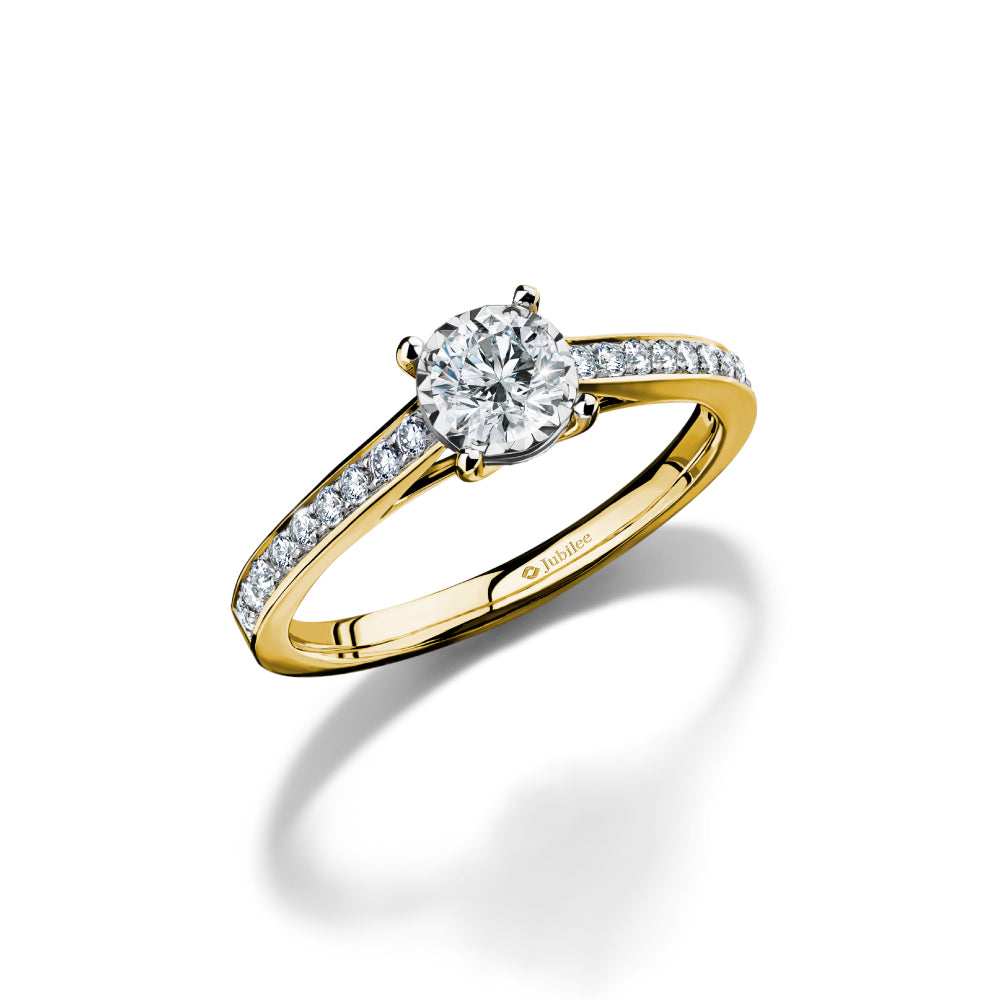 This ring is inspired by timeless beauty, featuring a design that highlights the sparkling center diamond and a delicately set diamond setting. The yellow gold finish adds a classic touch and completes the wearer's look with a touch of sophistication. Perfect for those seeking a beauty that reflects confidence and elegance.