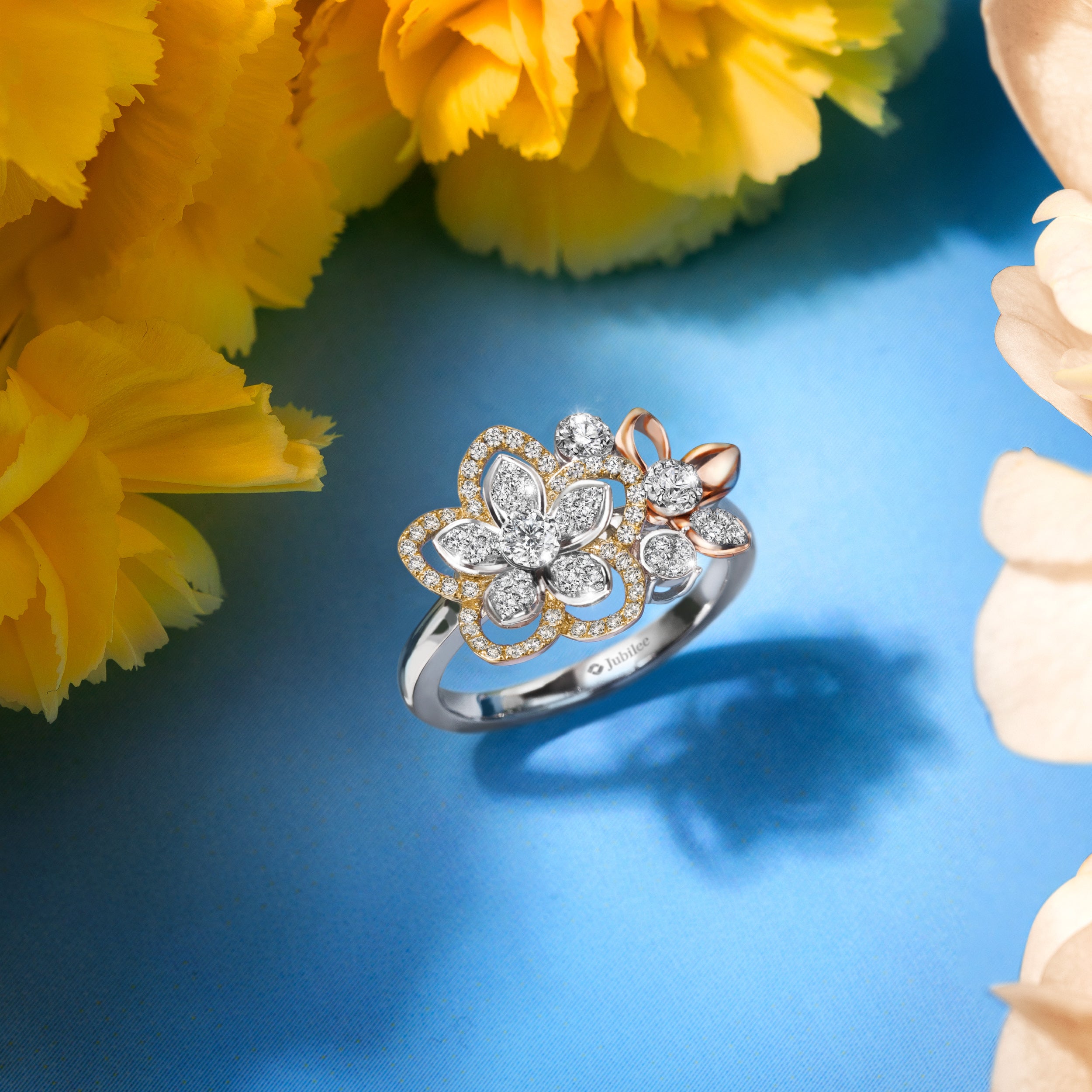The Everbloom Embrace Bouquet Ring captures the beauty of a sparkling bouquet, featuring a large, five-petaled flower adorned with Pavé diamonds and smaller, delicately embracing flowers of varying tones. This is a perfectly embellished piece of jewelry that reflects the diversity of love and beauty.