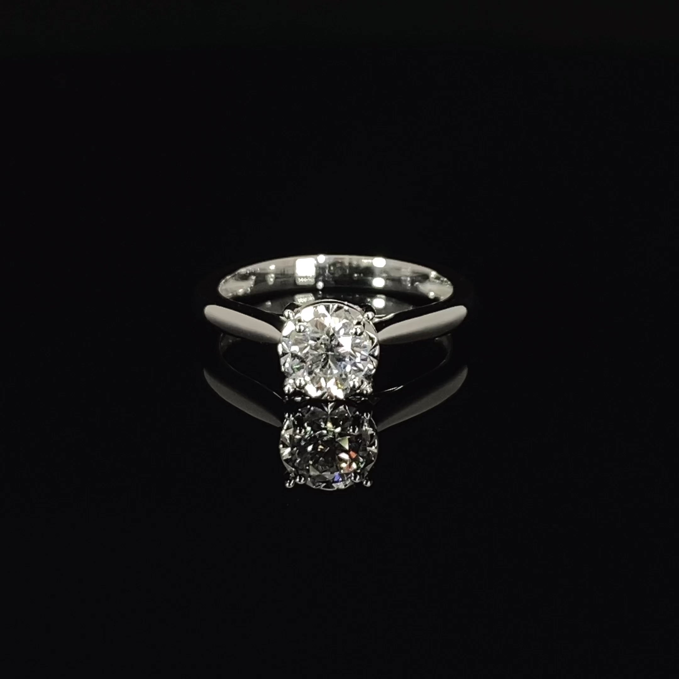Solitaire Round Brilliant-Cut Diamond: This ring features a beautiful solitaire round brilliant-cut diamond that sparkles brilliantly, highlighting Brilliance and Fire that reflects from every angle.