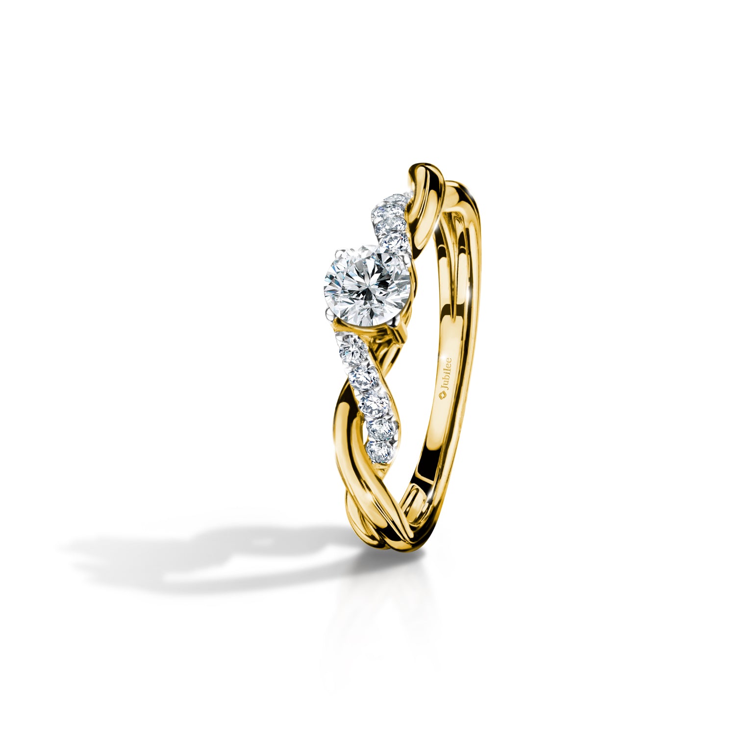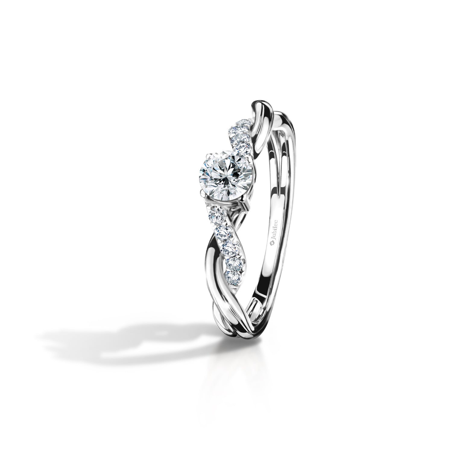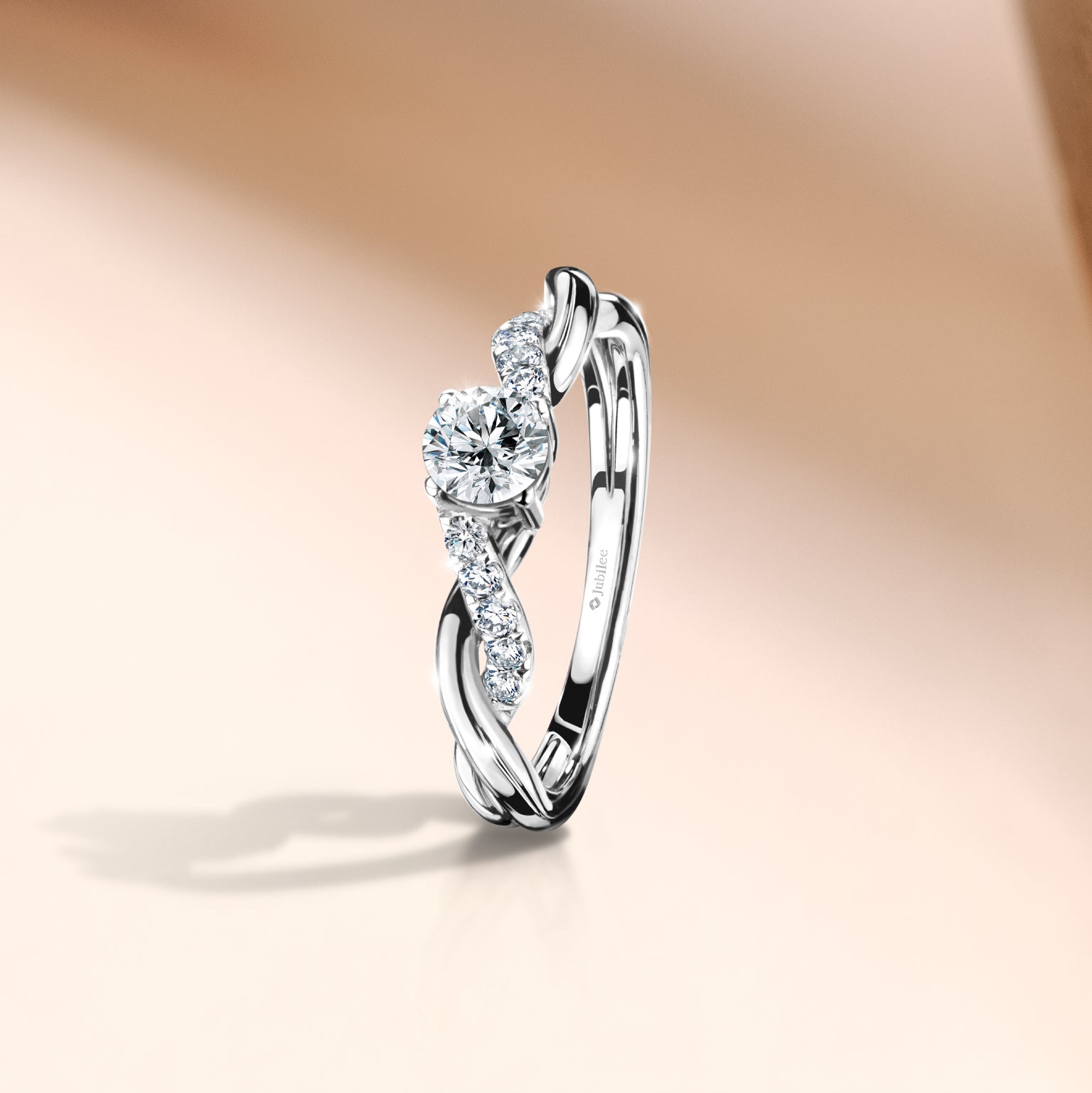 This ring is inspired by the beauty that comes from combining strength and tenderness. The twists of the setting reflect the undying love and bond, while the highlighted Round Brilliant-Cut diamond is designed to radiate maximum sparkle, creating a special feeling every time it is worn. The smaller diamonds set on the setting add elegance and sparkle with every movement.