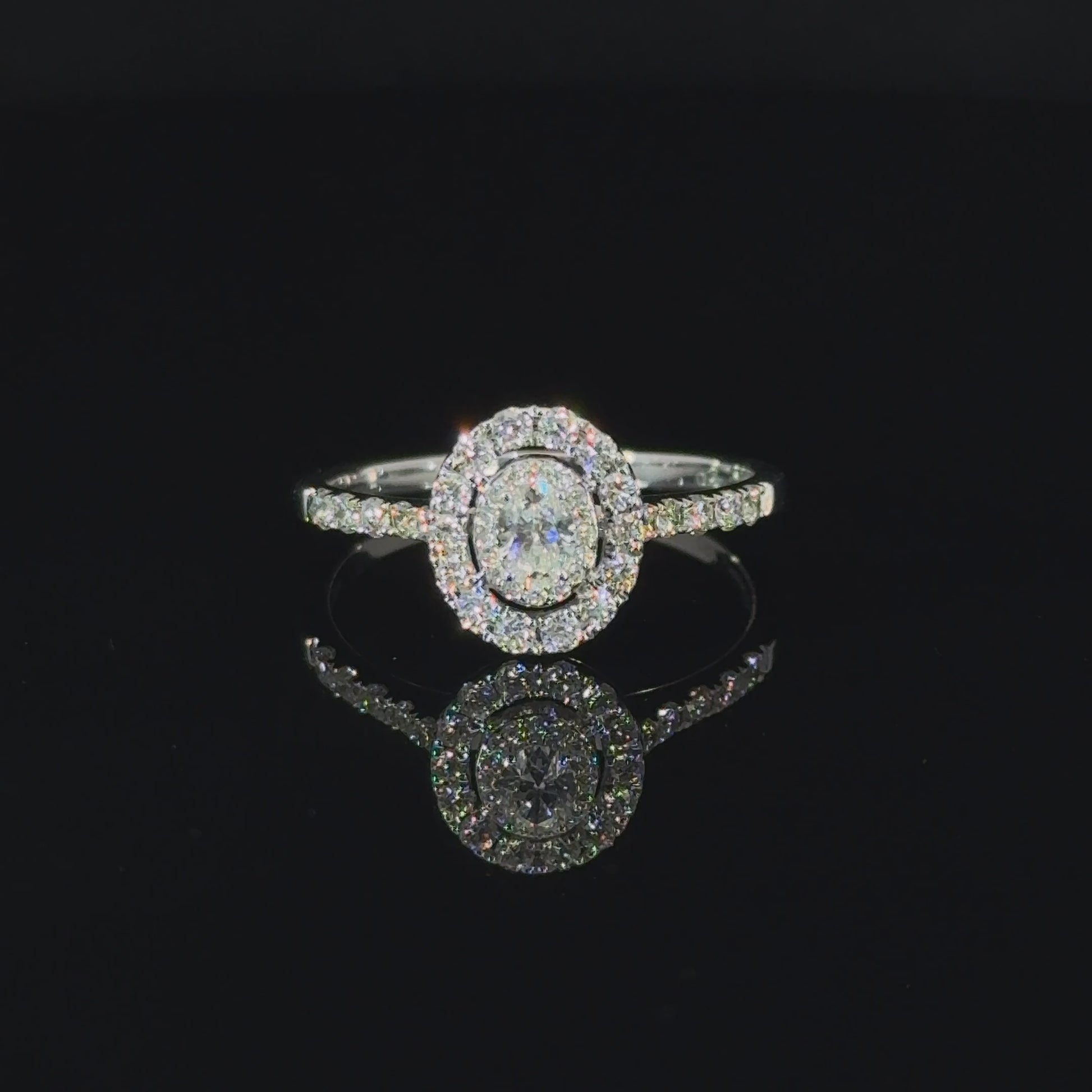 Oval Halo Setting: This ring features an oval-cut diamond set in a halo setting that enhances the sparkle of the center diamond.