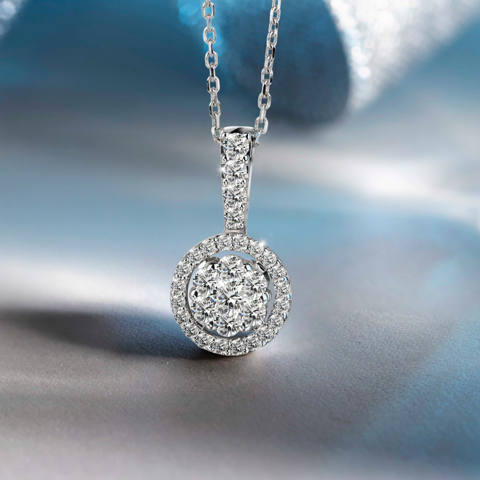 จี้เพชรชิ้นนี้ได้รับแรงบันดาลใจจากความงามในธรรมชาติ โดยใช้วงกลมเป็นสัญลักษณ์ของความไม่มีที่สิ้นสุด ตัวจี้ประดับเพชรแบบ Cluster ตรงกลางเสริมด้วย Halo ที่ทำให้ดูระยิบระยับเปล่งประกายมากยิ่งขึ้น ตัวเรือนทองคำขาวเติมเต็มความหรูหรา ให้กับชิ้นงานสะท้อนถึงความงดงามในทุกการเคลื่อนไหว