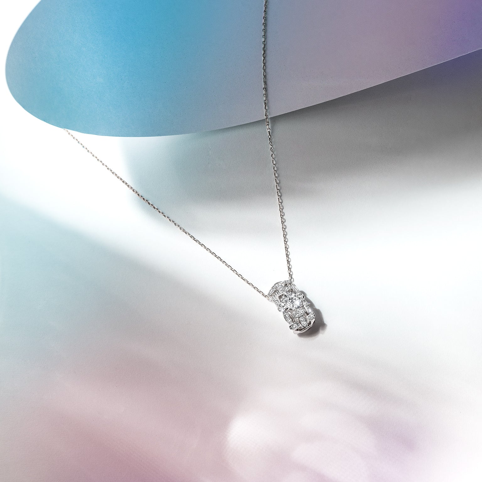 จี้ Jubilee Diamond สุดหรูนี้ประดับด้วยเพชรกลมตรงกลางที่โดดเด่นรายล้อมด้วยลวดลายกริดที่มีเพชรรูปทรงมาร์คีส์และทรงกลม การจัดเรียงที่พิถีพิถันและการฝังแบบ prong ช่วยเสริมความหรูหราและสง่างามของจี้ เหมาะสำหรับโอกาสพิเศษ และแสดงถึงความงามอันเป็นนิรันดร์ของงานฝีมือคุณภาพสูงในแบบ Jubilee Diamond