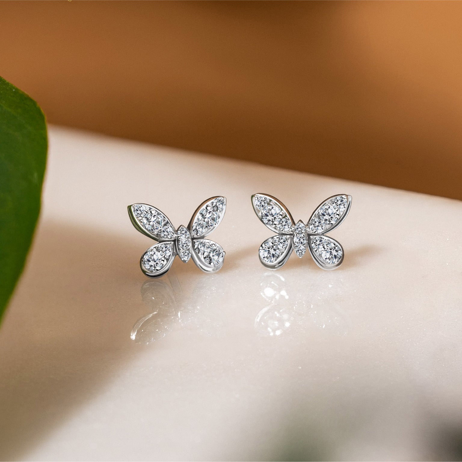 Crafted Detailing: การประดับเพชรด้วยเทคนิค Pavé Setting ทำให้ปีกของผีเสื้อดูกลมกลืนและเพิ่มมิติให้กับดีไซน์ เพิ่มประกายสว่างไสวและความล้ำค่าให้กับต่างหู