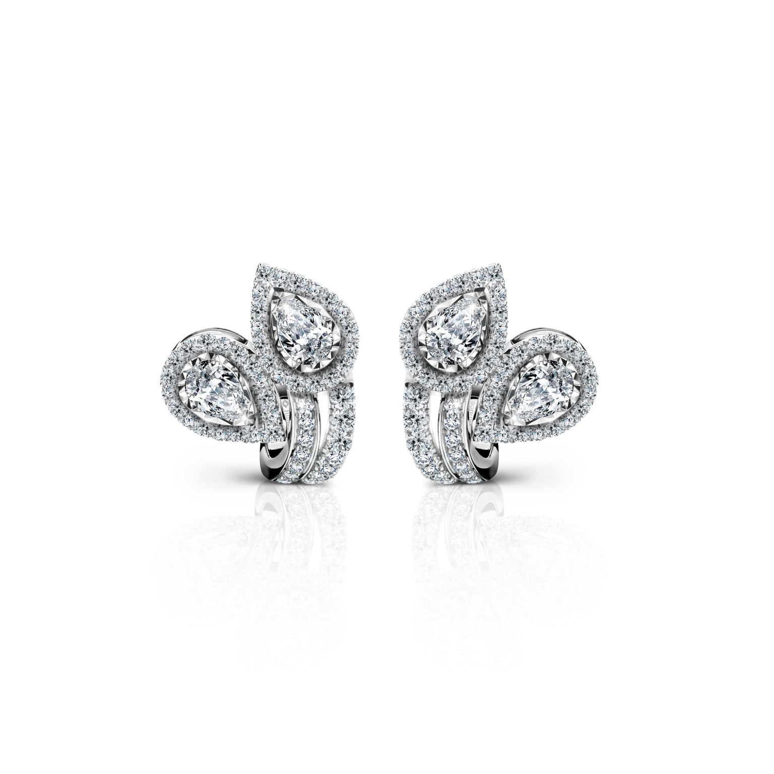 ต่างหูเพชรดีไซน์รูปทรงใบไม้เรียงซ้อน ประดับด้วยเพชรทรง Pear Shape ที่จัดวางอย่างสมดุลและล้อมด้วย Pavé Setting อย่างละเอียดทุกมุมมอง ถ่ายทอดประกายที่พลิ้วไหวอย่างสง่างาม