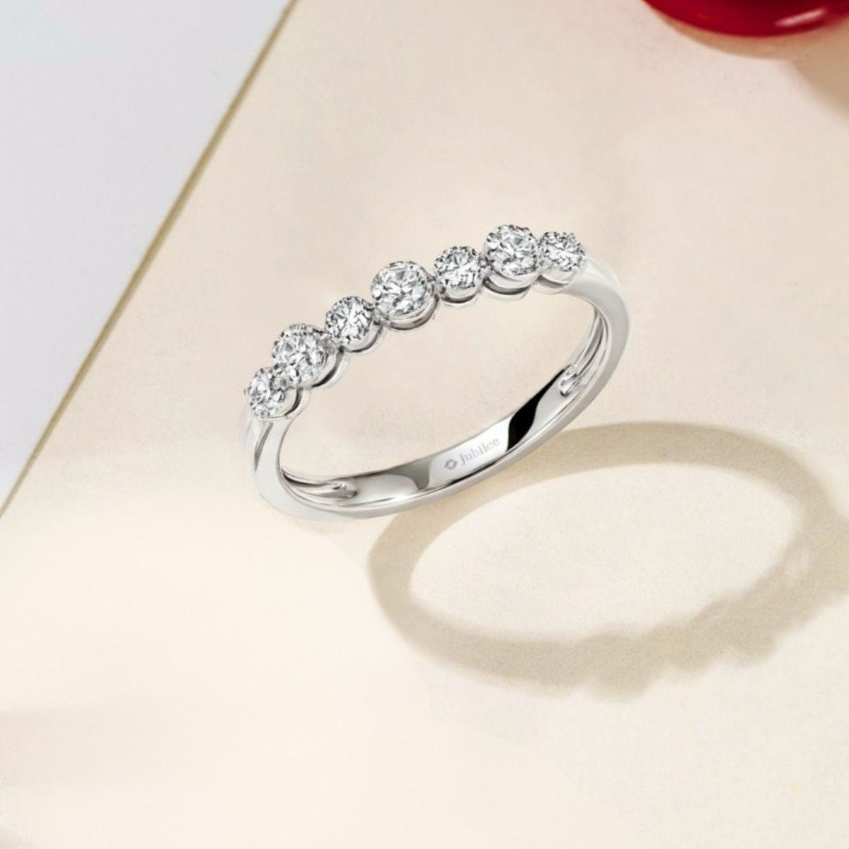 ดีไซน์เรียงเพชรหกเม็ด: แหวนที่ประดับเพชรหกเม็ดอย่างลงตัว เรียงกันจากขนาดเล็กไปใหญ่ เพื่อความสวยงามและสมดุล