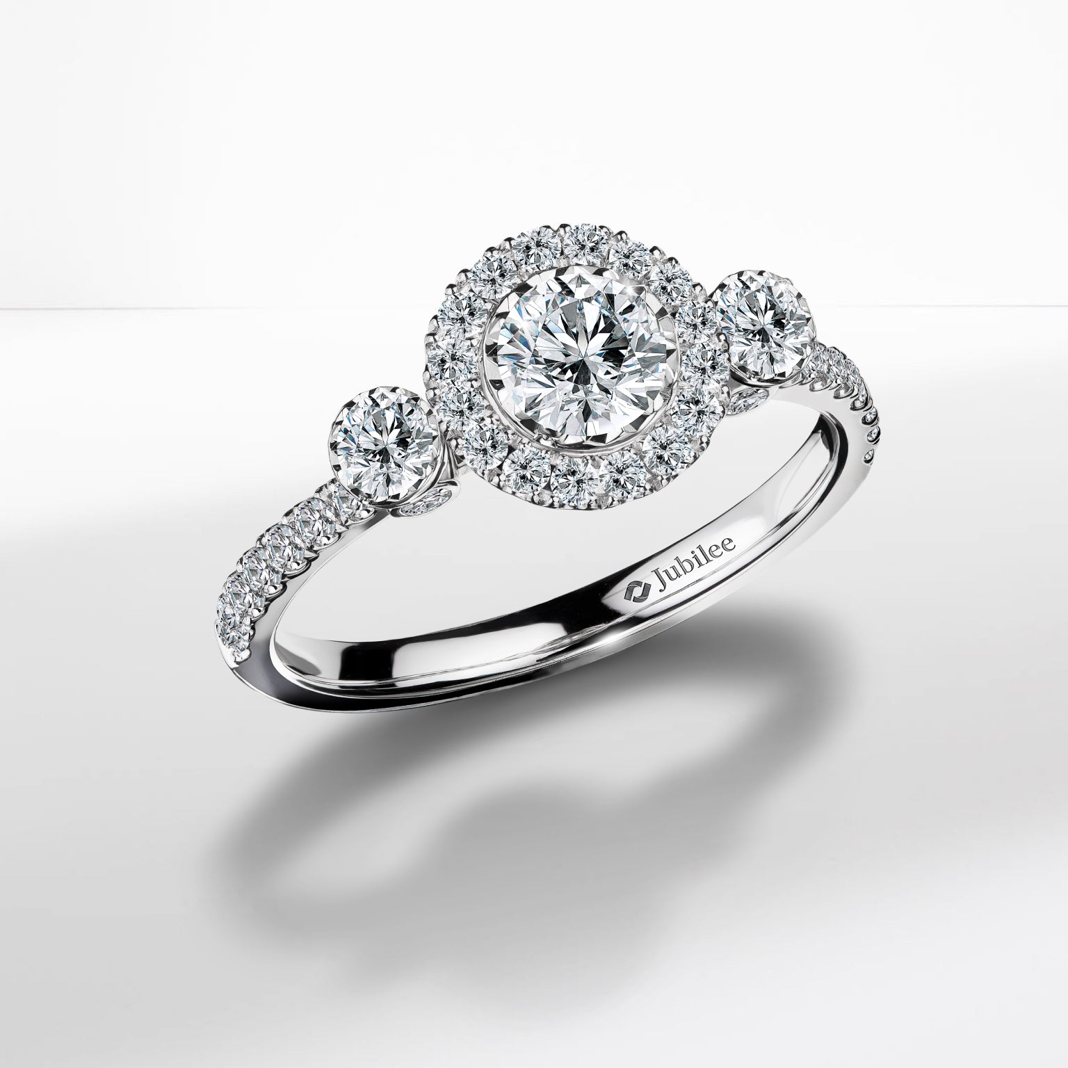Three-Stone Halo Design: แหวนเพชร Three-Stone Design ที่ประดับเพชรเม็ดกลาง Round Brilliant-Cut ขนาดใหญ่ล้อมรอบด้วยเพชรแบบ Halo และเพชรข้างสองเม็ดช่วยเพิ่มความโดดเด่นและเปล่งประกาย