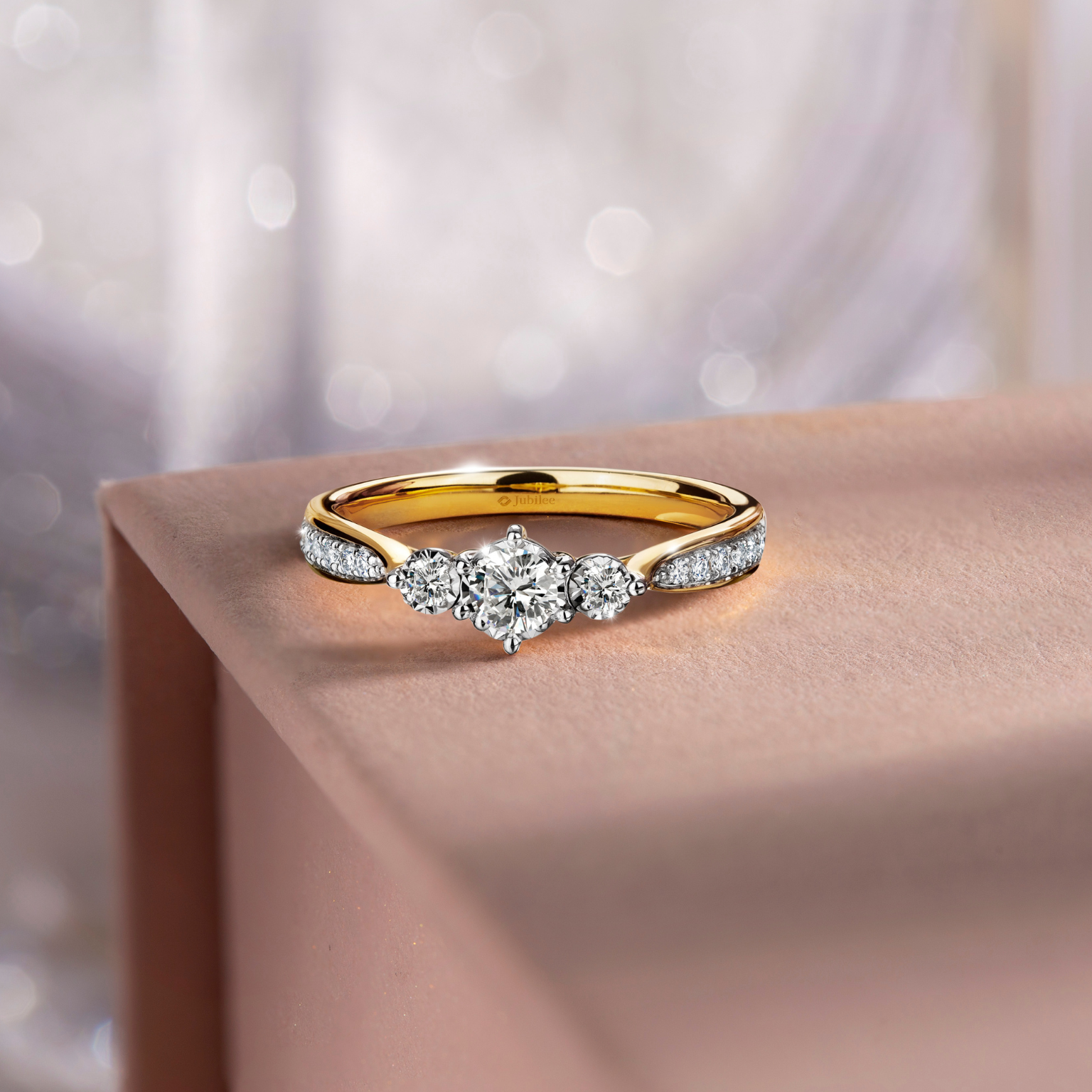 Three Stone Diamond Setting: แหวนประดับด้วยเพชร Three-Stone Setting ใช้เพชร Round Brilliant-Cut Diamond เป็นหลัก ซึ่งสื่อถึงอดีต ปัจจุบัน และอนาคตที่สวยงาม